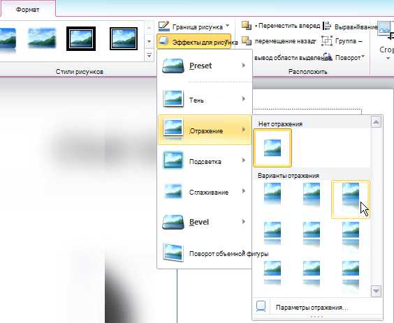 Отражение – еще один эффект, используемый для создания визуального интереса. Он отражает изображение под ним, создавая эффект зеркального отражения. Вы можете настраивать различные параметры отражения, включая угол отражения, прозрачность и расстояние от изображения. Таким образом, можно создать эффект трехмерности и улучшить визуальное восприятие изображения.